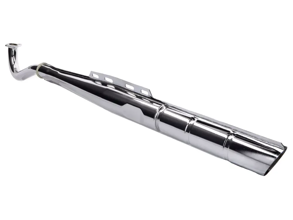 Verchromter 2-teiliger Nachbau der originalen Auspuffanlage mit 28mm Krümmerrohr.