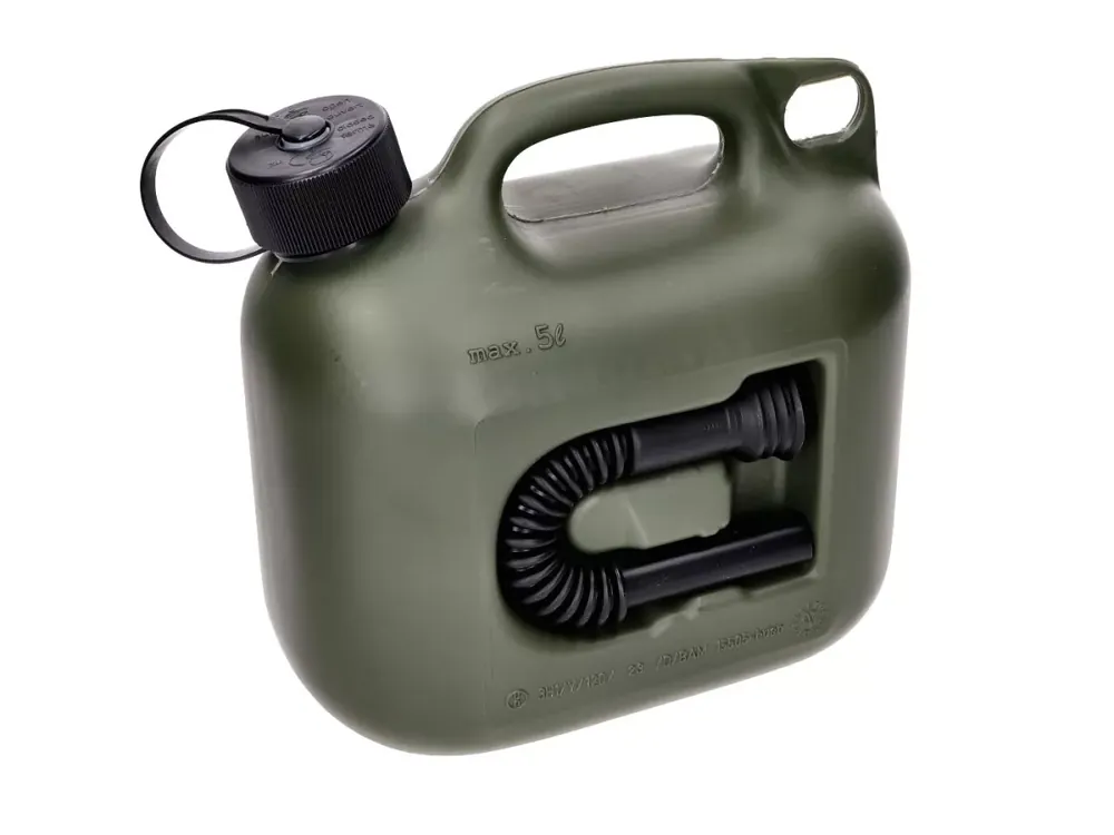 Grüner Kraftstoffkanister mit 5 Liter Fassungsvermögen und einem im Kanisterkörper integrierten Auslaufrohr für Dieselfahrzeuge.