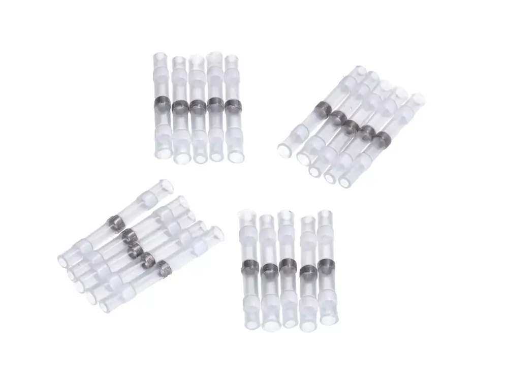 Die entsprechend abisolierten Leitungen einfach in den Verbinder einführen. Anschließend mit einem Heißluftgebläse den Lotring zum Schmelzen bringen. Den Verbinder mit dem Heißluftgebläse solange erwärmen, bis der Kleber an den Enden austritt. Das bietet eine einfache und schnelle Lösung für zugfeste, feuchtigkeitsdichte Kabelverbindungen.