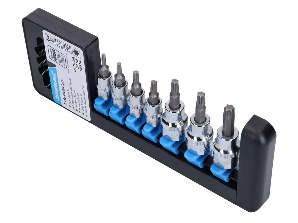 7-teiliger Satz Steckschlüssel mit 1/4-Zoll- und 3/8-Zoll-Antrieb und passenden TX-Bits von T10 bis T40. Praktische Kombination aus Vierkant-Steckschlüsseleinsätzen aus poliertem Chrom-Vanadium-Stahl und vergüteten, satinierten TX-Bits.
