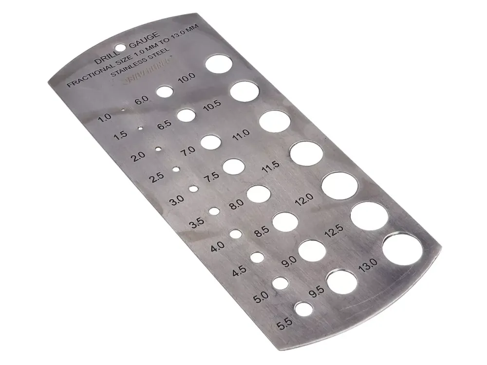 Bohrerlehre aus vergütetem Edelstahl. Mit geätzten Größenangaben von 1.0 mm bis 13.0 mm. Geeignet um Durchmesser von Spiralbohrern zu ermitteln. Auch die Größe von anderen runden Objekten lässt sich mit der Bohrlehre bestimmen.