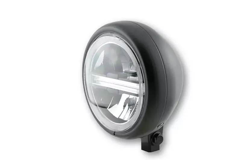 Der HIGHSIDER 5 3/4 Zoll LED-Scheinwerfer PECOS Typ 6 überzeugt durch sein puristisches Design, modernste Lichttechnologie und hochwertige Verarbeitung aus Metall. Das mattschwarze Gehäuse mit klarem Glas sorgt für ein edles Erscheinungsbild und hohe Haltbarkeit. Besonders hervorzuheben ist das integrierte Tagfahrlicht (TFL) sowie der Standlicht-Ring, die für maximale Sichtbarkeit und Sicherheit im Straßenverkehr sorgen. Der mittig positionierte Lichtstreifen fungiert als Tagfahrlicht, während in der oberen Hälfte das Abblendlicht leuchtet. Beim Einschalten des Fernlichts aktivieren sich beide Hälften für eine optimale Ausleuchtung der Straße. Der Scheinwerfer ist E-geprüft und bietet eine zuverlässige Qualität für viele gängige Motorradmodelle. Diese Scheinwerfer-Serie verbindet hohe Funktionalität mit einem unverwechselbaren Stil – ideal für anspruchsvolle Fahrerinnen und Fahrer, die Wert auf Performance und Design legen.