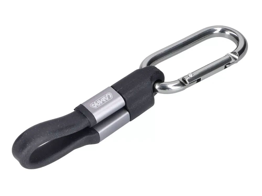 Kompaktes USB-C Ladekabel als Schlüsselanhänger mit Karabiner. Schnellladefähig und zur Datenübertragung geeignet.