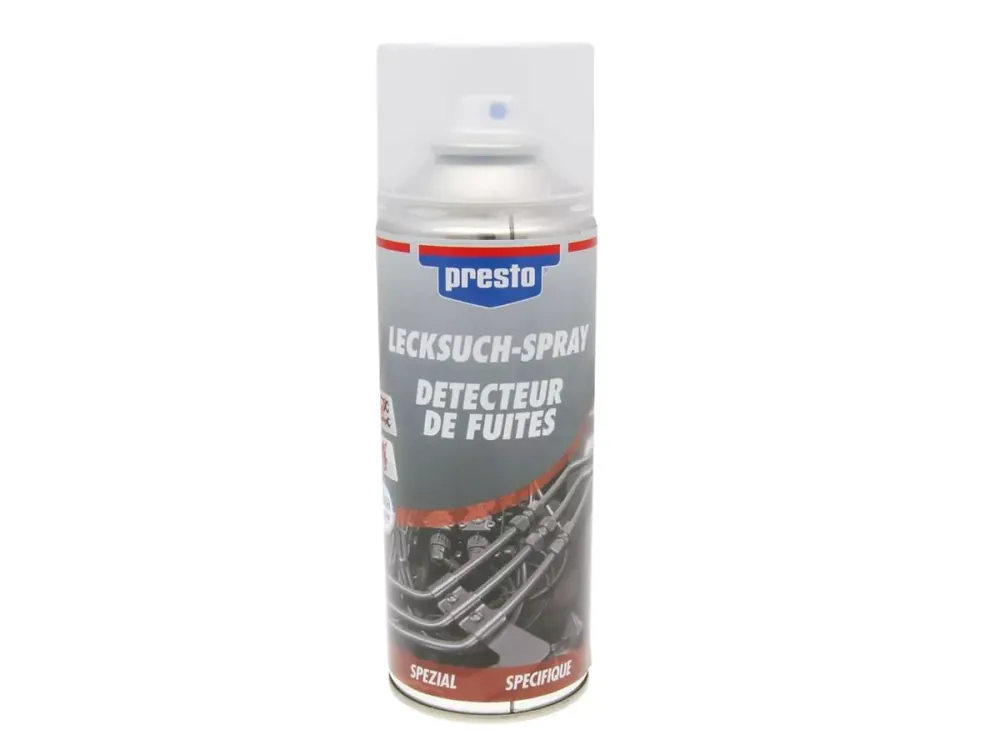 Durch das Aufsprühen mit dem presto Lecksuch-Spray können undichte Stellen an Druckluft- und Gasleitungssystemen aufgespürt werden. Die Leckagen werden durch Blasenbildung angezeigt. Der aufgesprühte Schaum ist mit Wasser leicht zu entfernen. Hinterlässt keine Rückstände, welche die Reparatur erschweren. Ein wichtiges Hilfsmittel wenn ein Leck an einer schwer ersichtlichen Stelle ist. Einsatzgebiete sind meist Reifen, Schläuche, Tanks, Wellendichtringe.