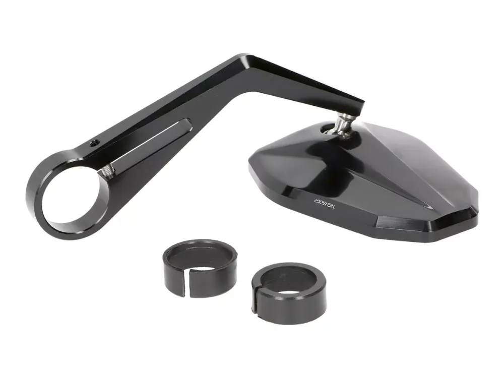 Schwarz eloxierter Aluminium-Lenkerendenspiegel von Highsider. Dank der beiden Adapter kann der Spiegel am zölligen (25,4mm) oder metrischen (22mm) Lenker montiert werden.