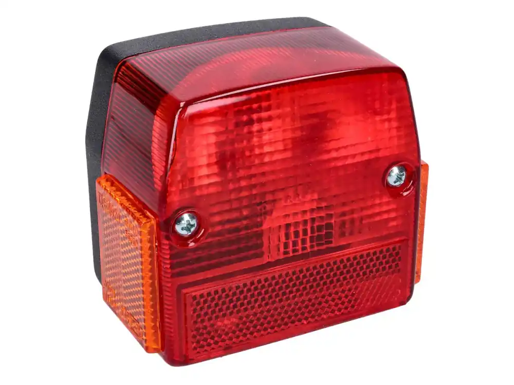 Rücklicht mit seitlichen Reflektoren wie es ab Werk bei Puch Maxi P1 Mofas verbaut wurde. Es kann aufgrund seiner Größe und Universalität auch auf anderen Fahrzeugen und Marken eingesetzt werden.