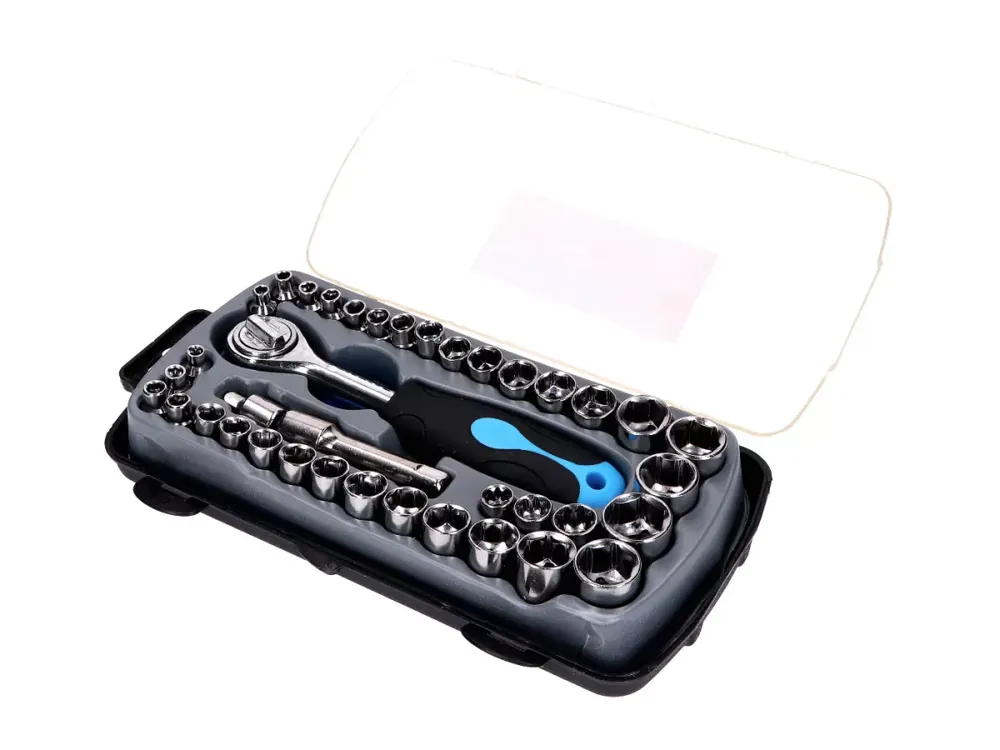 39-teiliger Satz Kompakt-Steckschlüssel. Im Satz sind metrische und zöllige Steckschlüsselaufsätze enthalten.