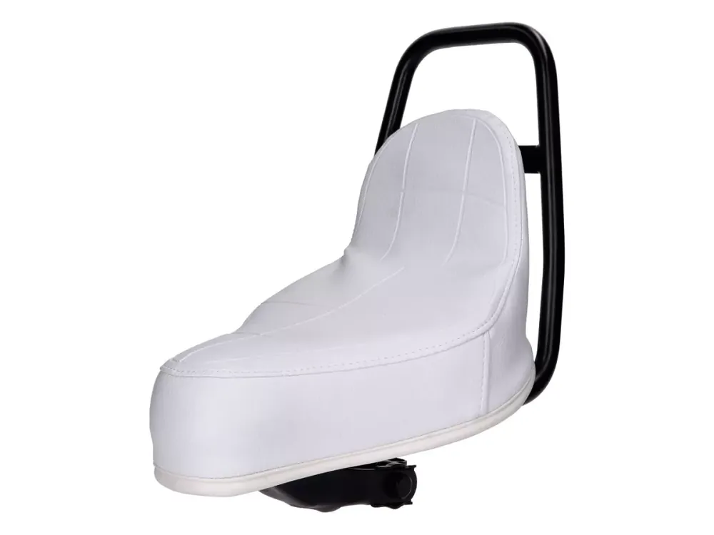 Bequemer weißer Chopper-Sattel im Bonanza-Look mit schwarzer Sissybar und schwarzem Puch-Schriftzug passend für Puch mit passendem 22mm-Sattelrohr.