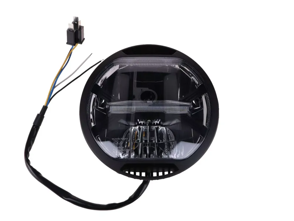 Der schwarz matte futuristische LED Hauptscheinwerfer mit seinem horizontalen Standlichtstreifen in der Mitte hat mit gerade einmal 85mm Tiefe ein sehr flaches Gehäuse aus Aluminium. Seine Kühlrippen auf der Rückseite sorgen für ausreichend Kühlung der modernen LED Elemente. Die Montage am Fahrzeug ist über verschiedene Schraubpunkte am Lampengehäuse möglich. Hier sind auf der Rückseite 6x M6x1 und seitlich 2x M8x1.25 Gewindebohrungen vorgesehen. Über das Anschlusskabel werden Standlicht, Fahrtlicht und Fernlicht geschalten. Ein H4 Adapter Stecker ist bereits geklemmt. Lediglich der LED Standlichtstreifen muss über 2 Kabel selbst belegt werden. Mit einem Außendurchmesser von 170mm passt der KOSO Thunderbolt an viele Scrambler, Café Racer, Enduro, Nacked Bikes und könnte bei einem Restomod der Hingucker sein. Die Ausleuchtung und Helligkeit entspricht den Anforderungen der Straßenverkehrsordnung und wird vom Hersteller als sehr gut beschrieben.