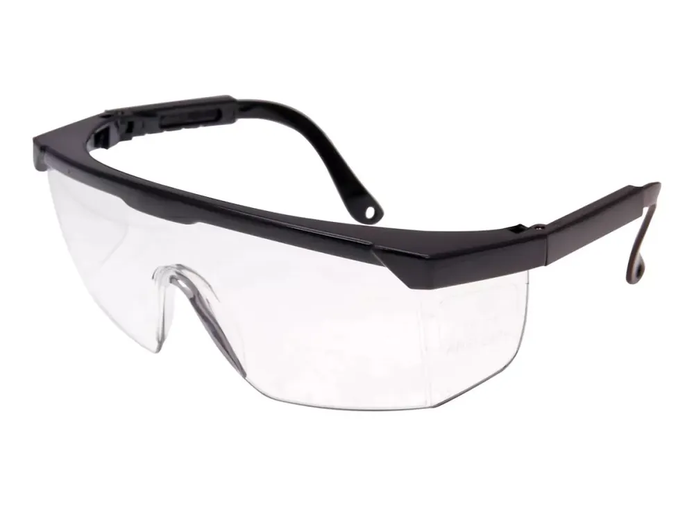 Kratzfeste Schutzbrille mit Seitenschutz und verstellbaren Bügeln.