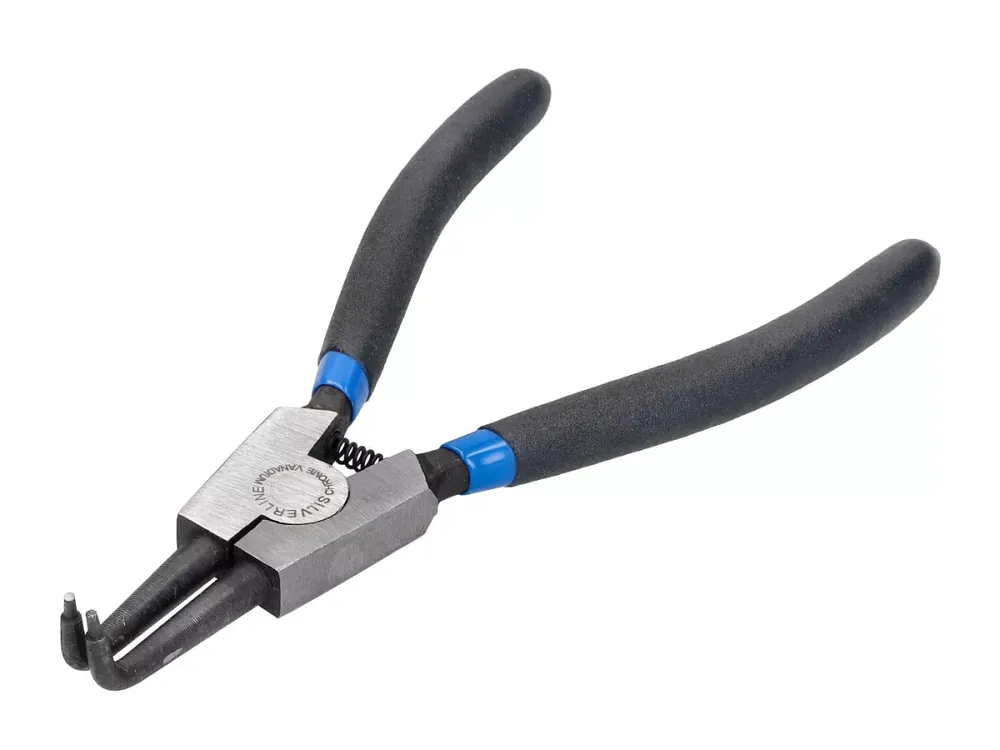 Abgewinkelte Sicherungsringzange für Außenringe. Aus vergütetem Chrom-Vanadium-Stahl. Gesamtlänge 180mm. Ideales Werkzeug, um Ringe auf Wellen zu fixieren oder von Wellen zu entfernen. Diese Variante mit gegenläufigem Mechanismus öffnet die Zangenbacken beim Schließen der Griffe. Sichere und komfortable Bedienung durch eine doppelte PVC-Beschichtung an den Griffen.