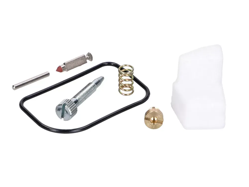 Vergaser Revisionskit für Dellorto Typ SHA 12, SHA 13 bestehend aus Schwimmernadelventil, Einstellschraube für den Vergaserschieber mit passender Feder, Vergaser Schwimmer mit Pin, Hauptdüse und Dichtung für die Vergaserwanne.